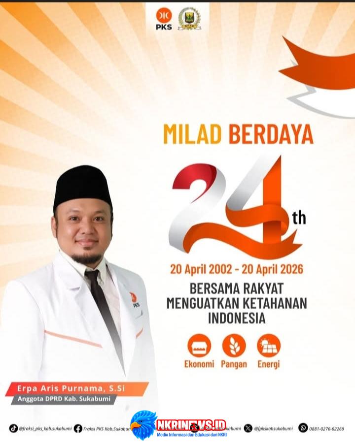 Sukabumi – Peringatan Milad ke-24 Partai Keadilan Sejahtera (PKS) yang jatuh pada 20 April 2026 menjadi momen refleksi sekaligus harapan baru bagi perjalanan partai. Anggota DPRD Kabupaten Sukabumi dari Dapil VI, Erpa Aris Purnama, S.Si, turut menyampaikan ucapan selamat dan pesan kebersamaan.